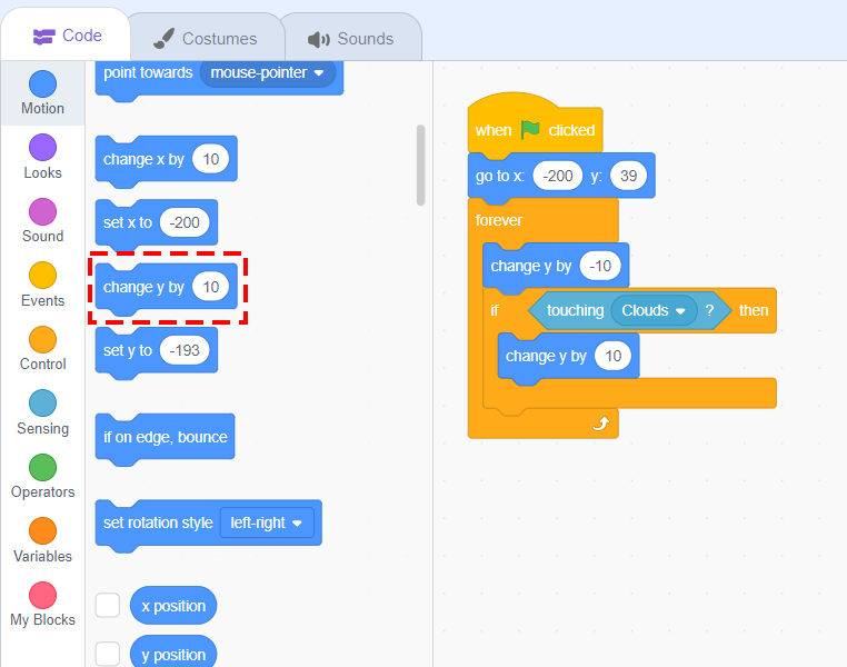 - In the Motion category, drag a change y by block to be in the if then block. Make sure that the number in the change y by block is the positive version of the one outside of the if then block. If you had a -10 in the first change y by block, you should have a 10 in the new one.
