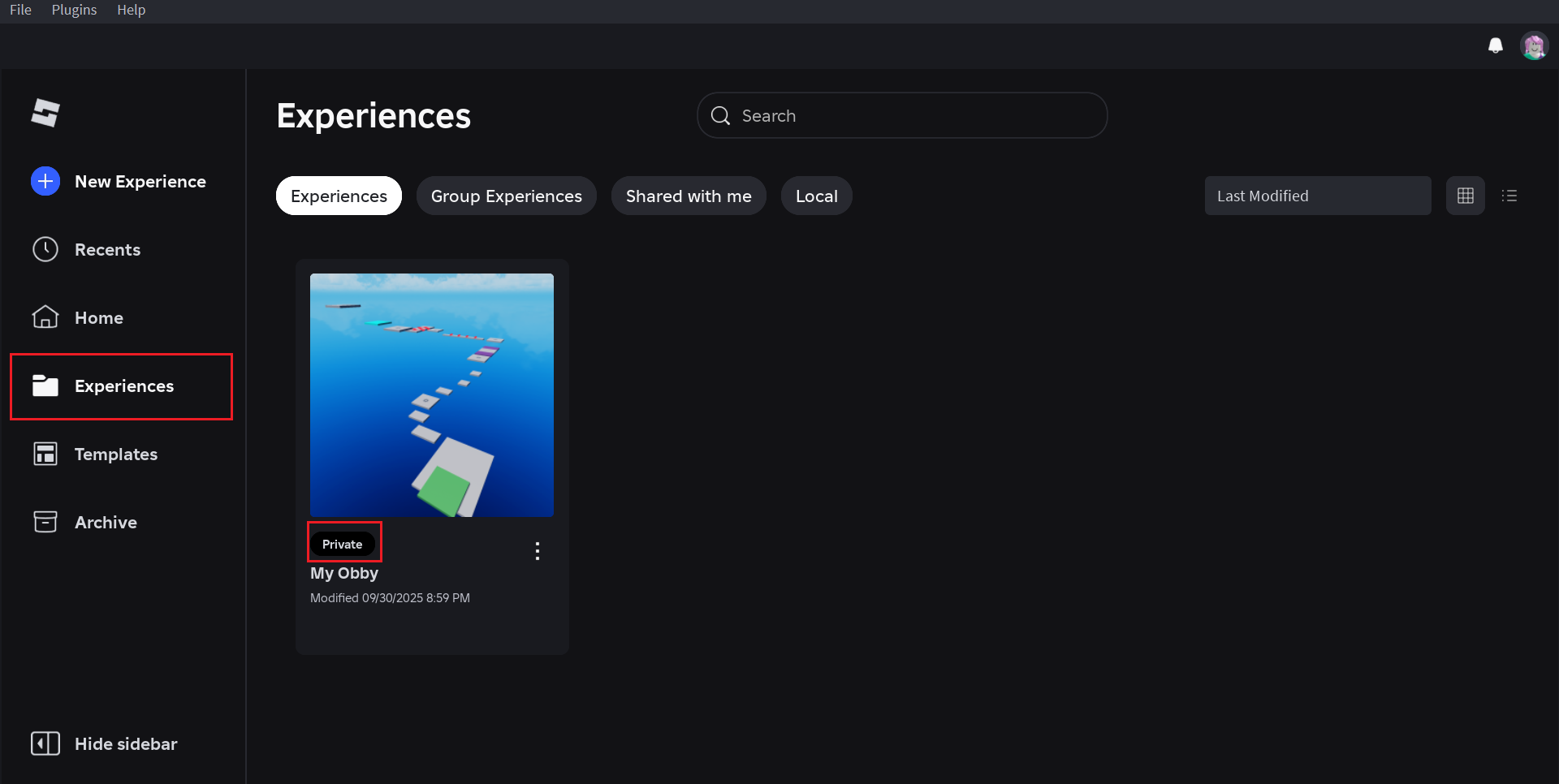 Your game is now published to the Roblox platform! You can double-check that your game is published in the Experiences section of Roblox Studio.